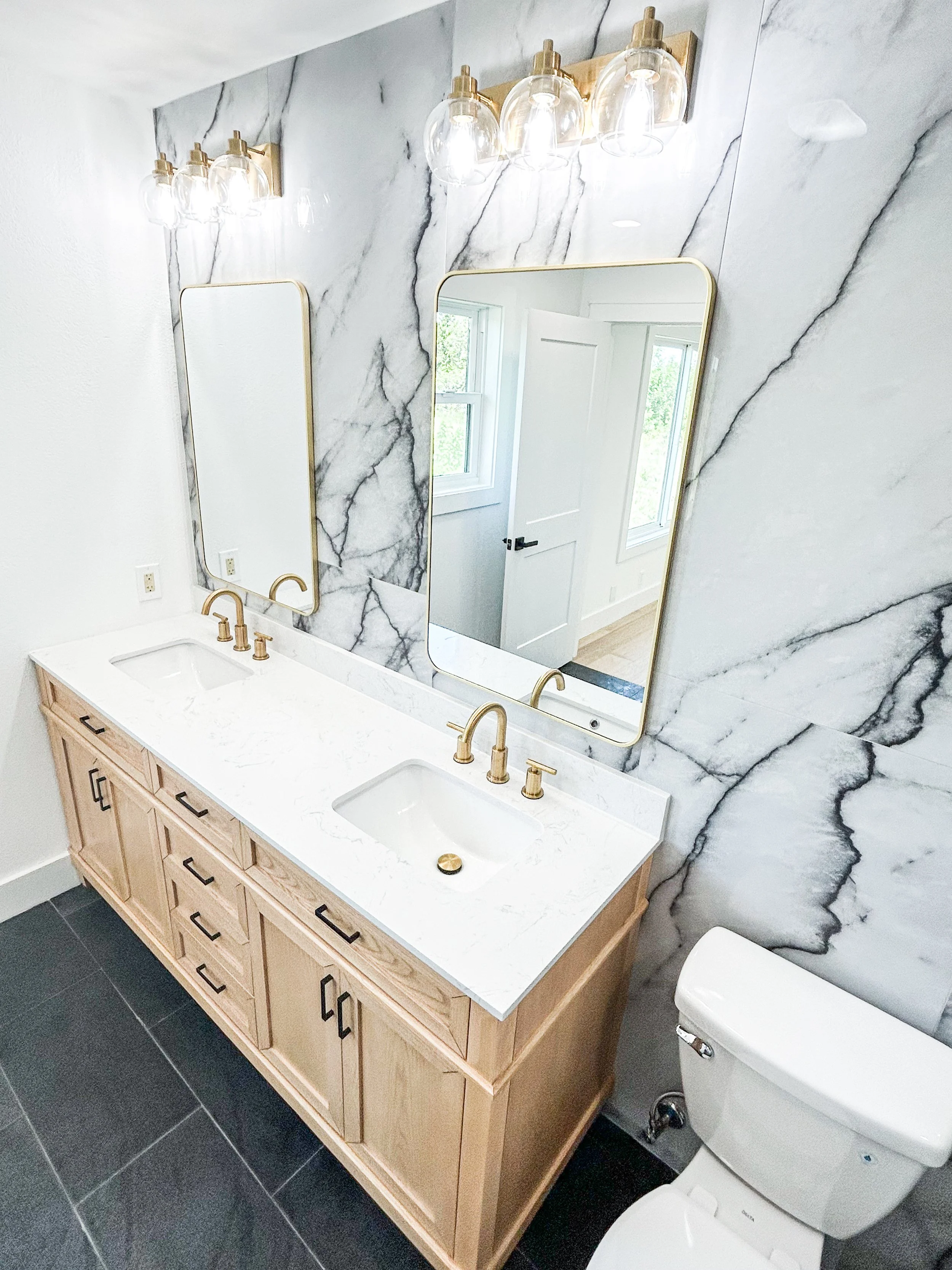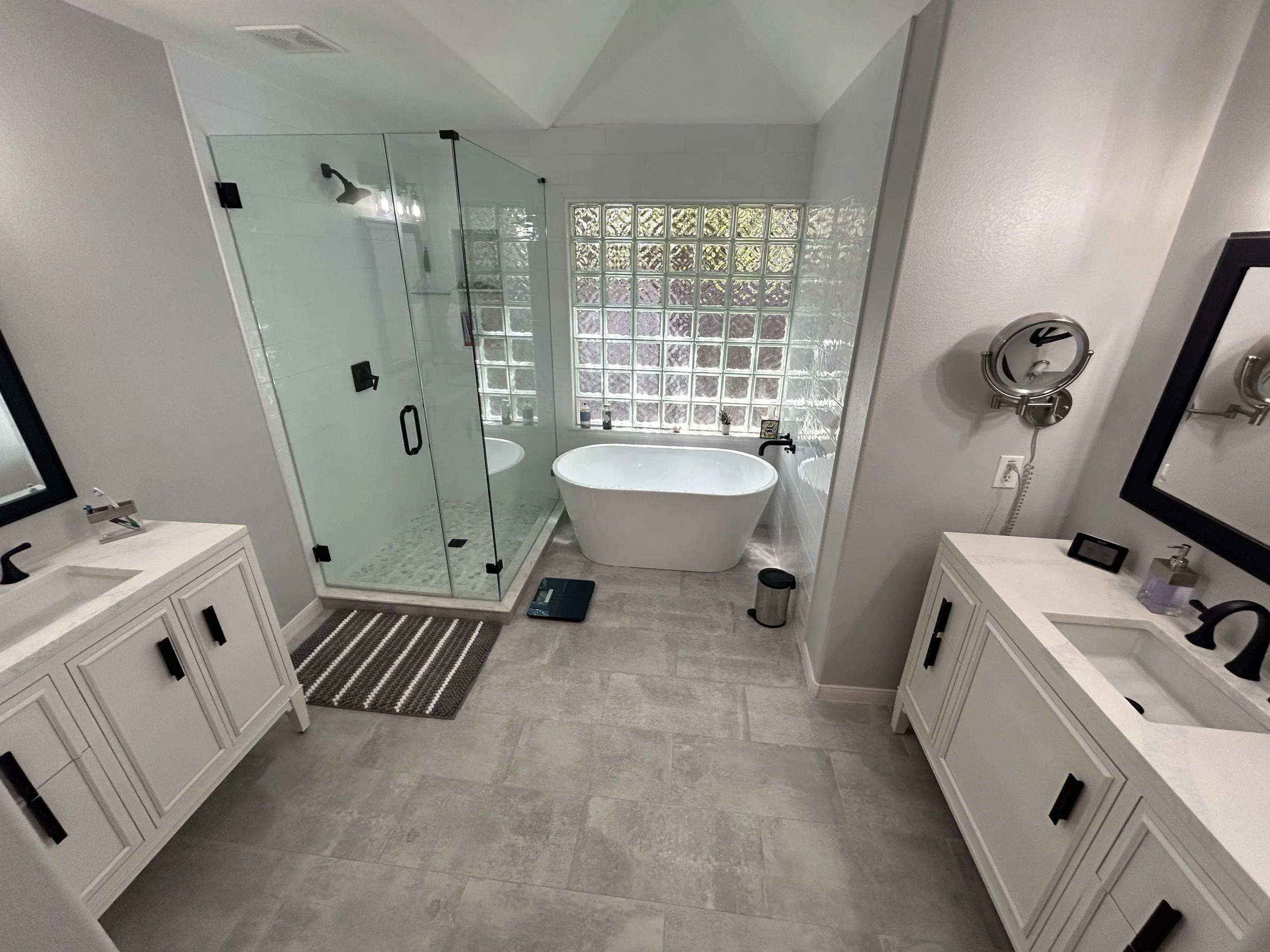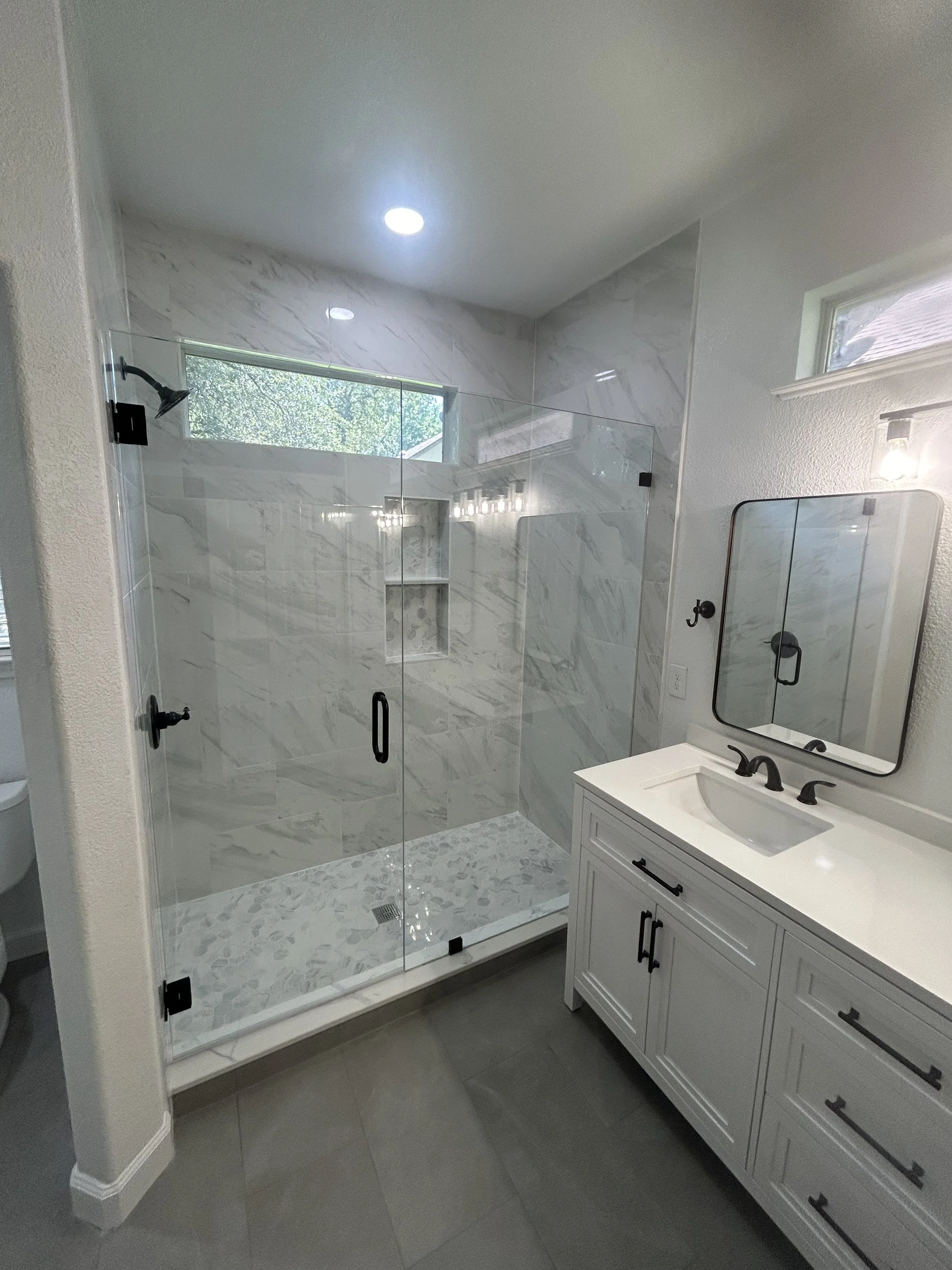 Bathroom remodels are another space you can do a lot with a lot or with little. We can help you with any budget. We can just do floor tile, vanities, counter tops, or we can do it all. Demo and start over with a fresh new plan and ideas. You bring the design or we can help with that too!
