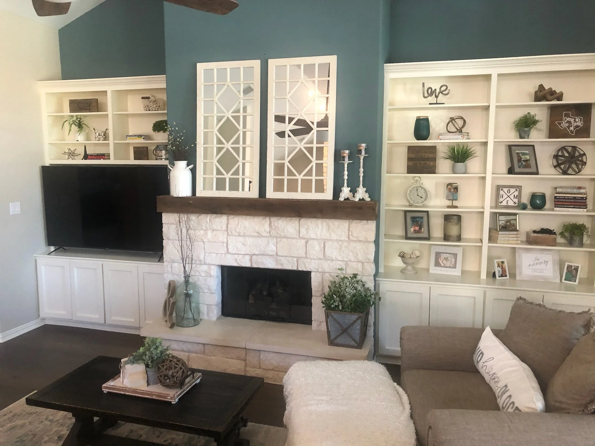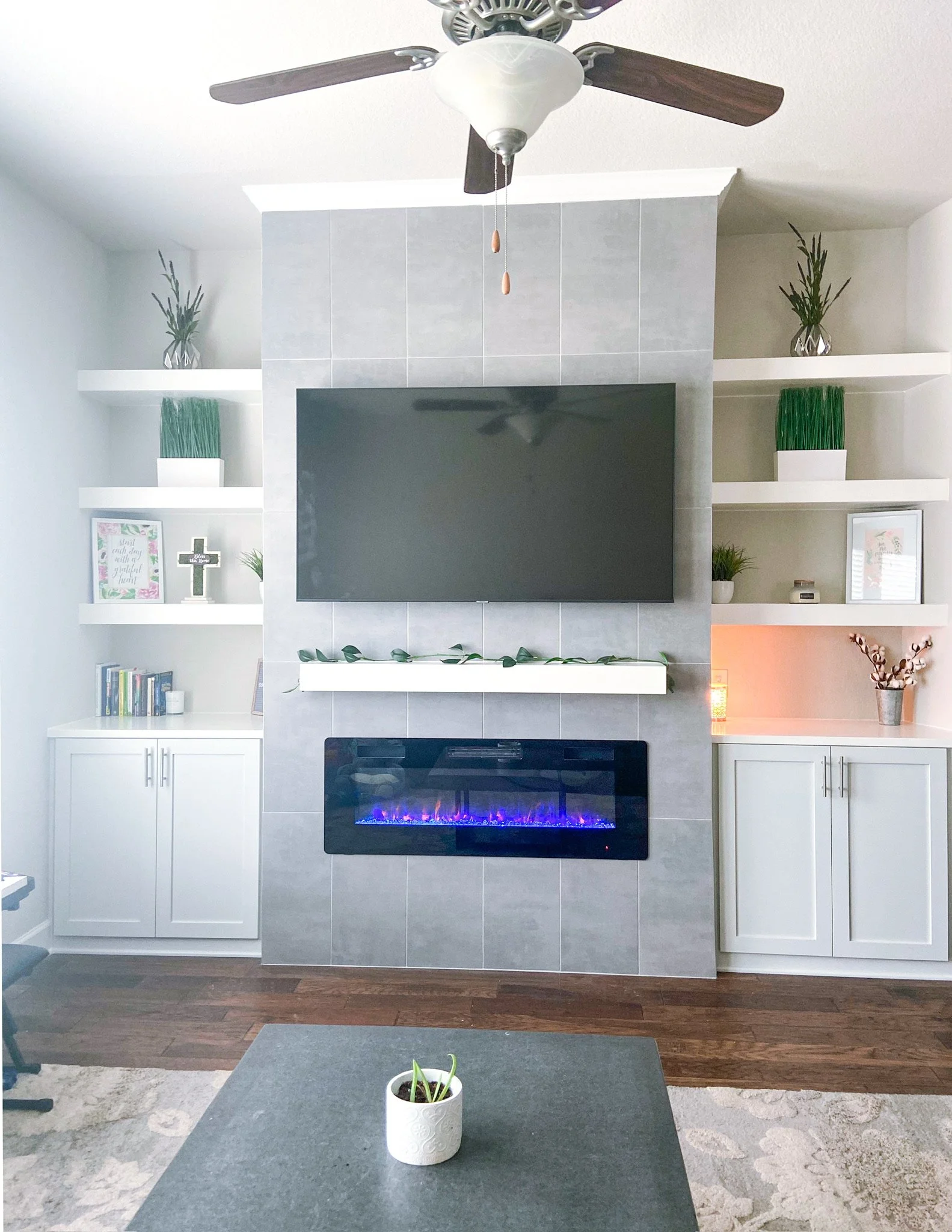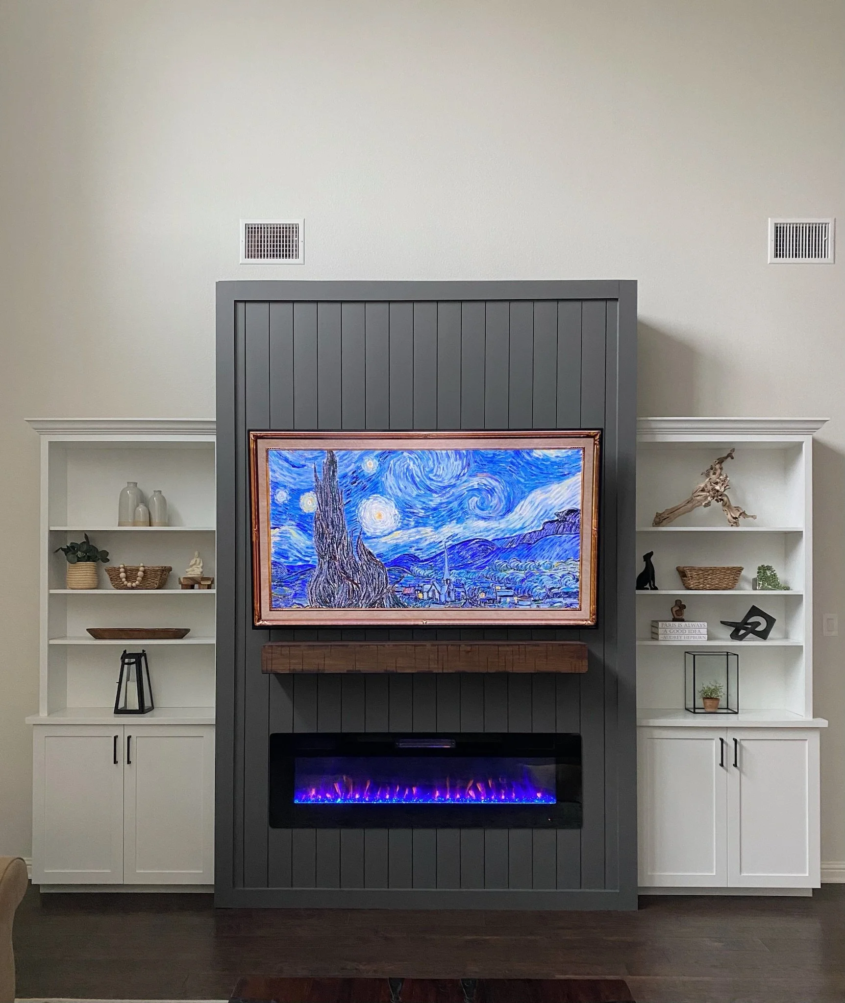 The one above and below were simple blank walls with nothing but a tv. We created a buildout, and finished out with custom cabinets, shelving, and accents like tile or shiplap, accenting everything with some color.